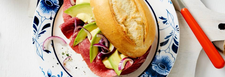 Cut open the pistols and spread with three quarters of the mustard mayonnaise. Divide the brine meat, avocado slices, gherkin and onion over the pistols.