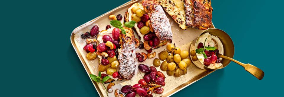 Divide the grapes, cranberries and cranberry nut mix over the baking tray. Sprinkle with cinnamon and drizzle with maple syrup. Roast for 10 minutes in the preheated oven.