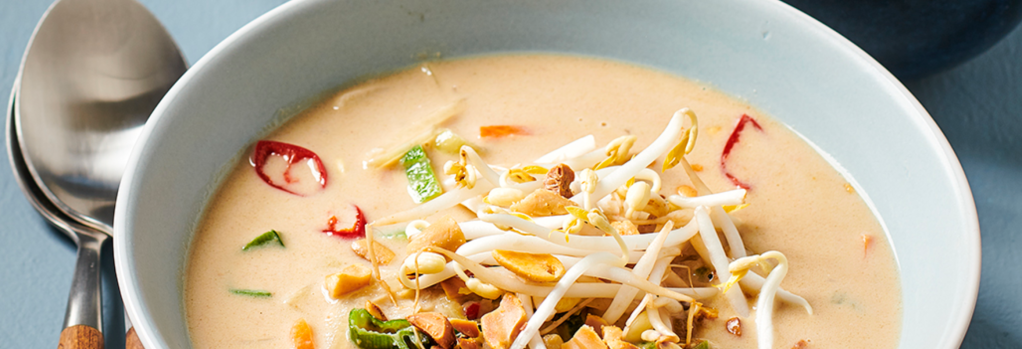 Serve the soup in deep plates and garnish with the bean sprouts, peanuts and the rest of the red pepper.