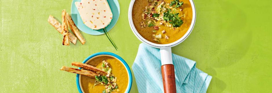 Serve the roasted bell pepper soup with the bread bars and cream cheese in flower shape and garnish with parsley.